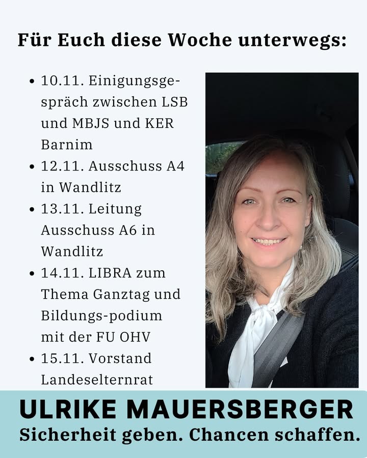 Lieben Dank für all eure lieben Rückmeldungen zu meiner Beförderung und meiner gestrigen Wahl.In dieser Woche bin ich natürlich auch wieder unterwegs mit mehreren Terminen in meinem Herzensthema Bildung und kommunalpolitisch in meiner Gemeinde in Wandlitz. Was habt ihr in dieser Woche auf dem Plan?#NahDran #KlarImWort #SicherheitGeben #ChancenSchaffen #füreuchunterwegs #politikfetzt #bildung
