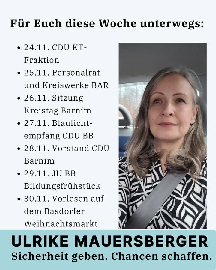 Das wird eine spannende und gute Woche mit interessanten Terminen wie der Kreistagssitzung im Barnim. Mich freut es an dieser Stelle, dass wir keine Diskussionen über die Schulgesundheitsfachkräfte führen müssen, sondern hier im Haushalt die finanziellen Mittel bereitstehen. Und nicht nur dafür sondern ebenso für die dringend benötigten Schulneubauten.Ich freue mich auch auf den Samstag und die Möglichkeit über Bildung mit der @ju_brandenburg zu diskutieren.Und pssst mein liebster Termin wird der Sonntag. Da lese ich wieder aus meinem dicken Grimm-Märchenbuch auf der Märchenbühne des Basdorfer Weihnachtsmarktes. Wer das nicht verpassen mag, der sollte um 15.30 Uhr auf dem Marktplatz sein 😊#füreuchunterwegs #politikfetzt #kommunalpolitikfetzt #ulrikemauersberger #klarimwort #NahDran #SicherheitGeben #ChancenSchaffen